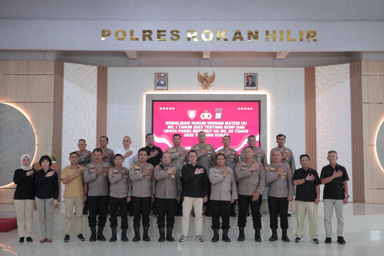 Rokan Hilir – macannusantara.id Dalam rangka meningkatkan pemahaman serta profesionalisme aparat penegak hukum, Polres Rokan Hilir melaksanakan kegiatan sosialisasi hukum dengan materi Undang-Undang Nomor 1 Tahun 2023 tentang Kitab Undang-Undang Hukum Pidana (KUHP) serta upaya paksa menurut Undang-Undang Nomor 20 Tahun 2025 tentang Kitab Undang-Undang Hukum Acara Pidana (KUHAP), Kamis (09/04/2026) di Mapolres Rokan Hilir.