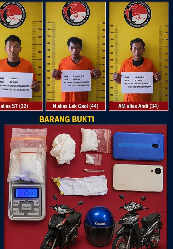 Dalam pengungkapan ini, polisi turut mengamankan sejumlah barang bukti, di antaranya dua plastik klip berisi sabu dengan total berat bruto 25,99 gram, satu kaca pirex, tisu, timah rokok, dua unit sepeda motor, satu helm, serta dua unit telepon genggam.